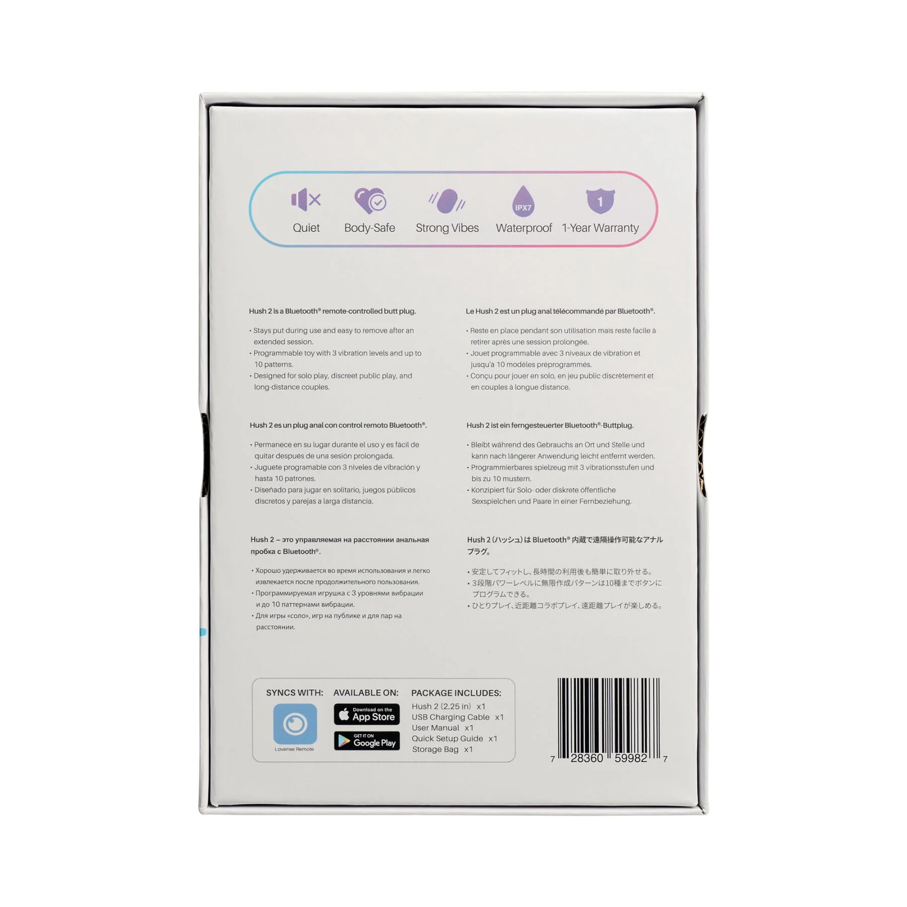 Не забувайте використовувати лубрикант на водній основі для комфортного використання. Після кожного застосування рекомендується промити пробку теплою водою з нейтральним милом або скористатися спеціальним очищувальним засобом для іграшок. У комплекті з Lovense Hush 2 ви отримаєте чохол для гігієнічного зберігання та транспортування, а також USB-кабель для заряджання.