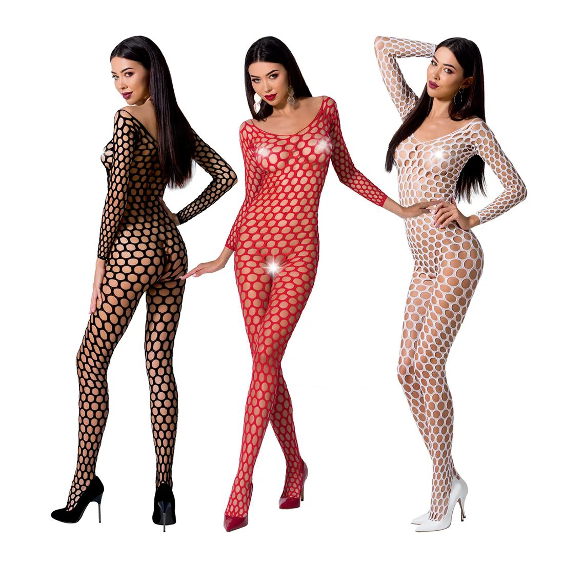 Одночасно одягнена і оголена – не фантазія, а реальність! Потрібно тільки купити бодістокінг з крупною сіткою Passion BS077: який закриває все тіло, він одночасно залишає простір для фантазії і – доступ до самих інтимних зон!
