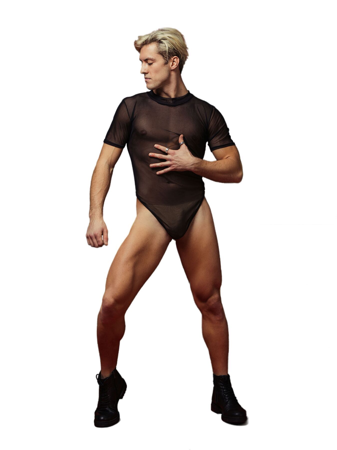 Боді виготовлено з м’якого сітчастого матеріалу, який ніжно облягає тіло, підкреслюючи кожну лінію вашої фігури. Сітчаста текстура не лише додає елегантності, а й забезпечує прекрасну вентиляцію, що робить його ідеальним вибором для спекотних днів або вечірок. Короткий рукав дозволяє показати ваші біцепси, а висока посадка нижньої частини боді ефектно відкриває сідниці, що додає образу сексуальності.