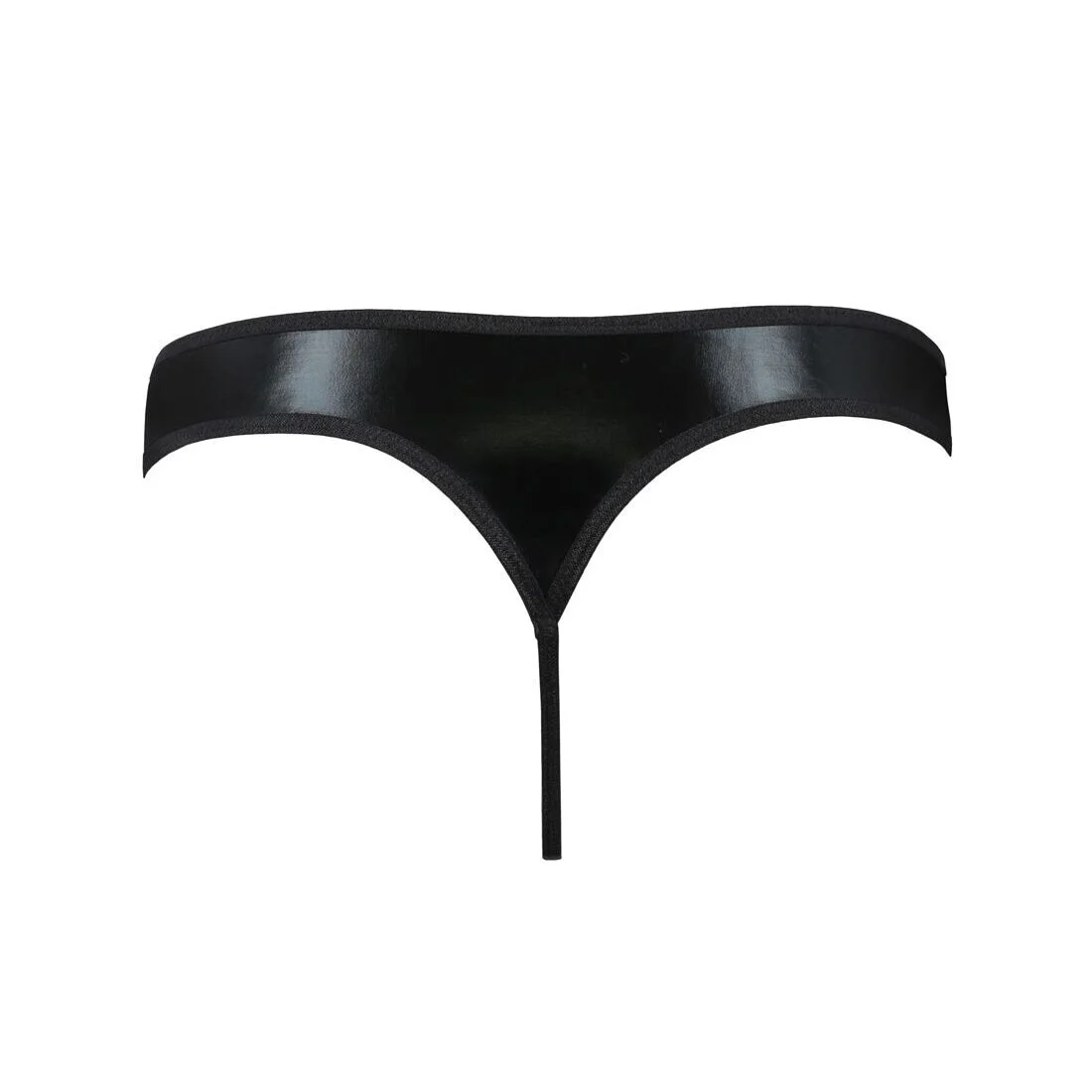Задня частина стрингів виконана у формі вузької смужки, що спокусливо оголює сідниці, надаючи образу додаткової сексуальності. Широка смужка «мокрого» матеріалу, що переходить у вузьку, створює враження елегантності та впевненості, підкреслюючи ваші форми.