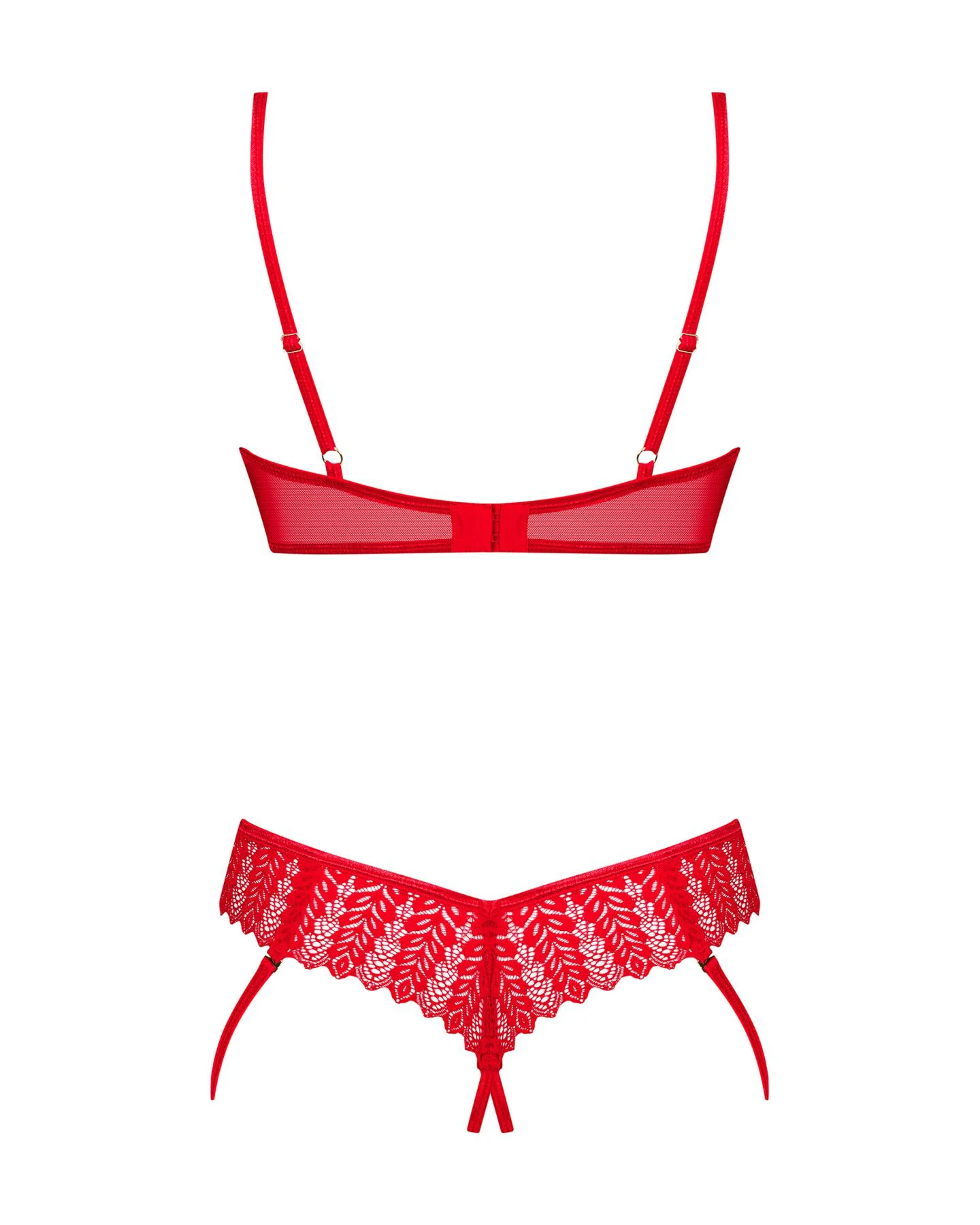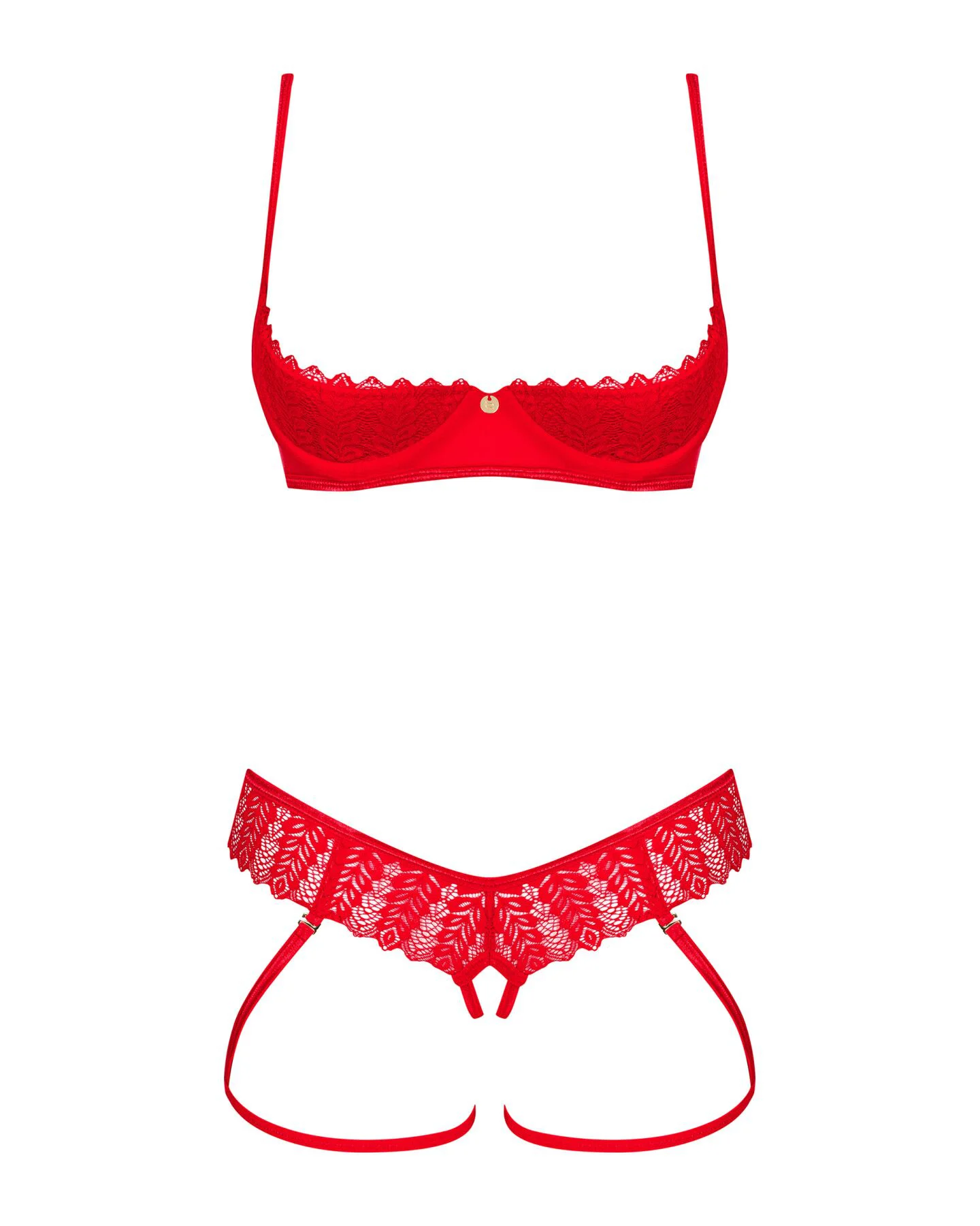 Комплект складається з двох основних елементів: бюстгальтера та трусиків. Обидва вироби виконані в яскравому червоному кольорі, що символізує пристрасть і вогонь. Розгляньмо детальніше кожен з компонентів: