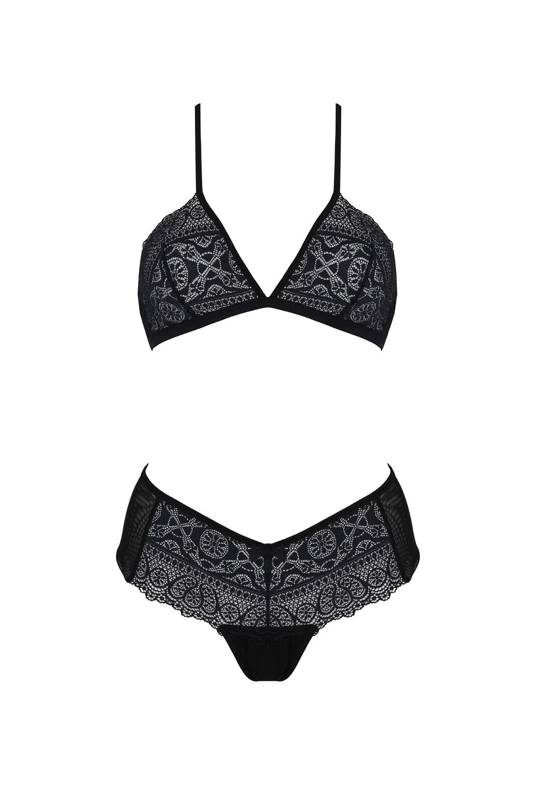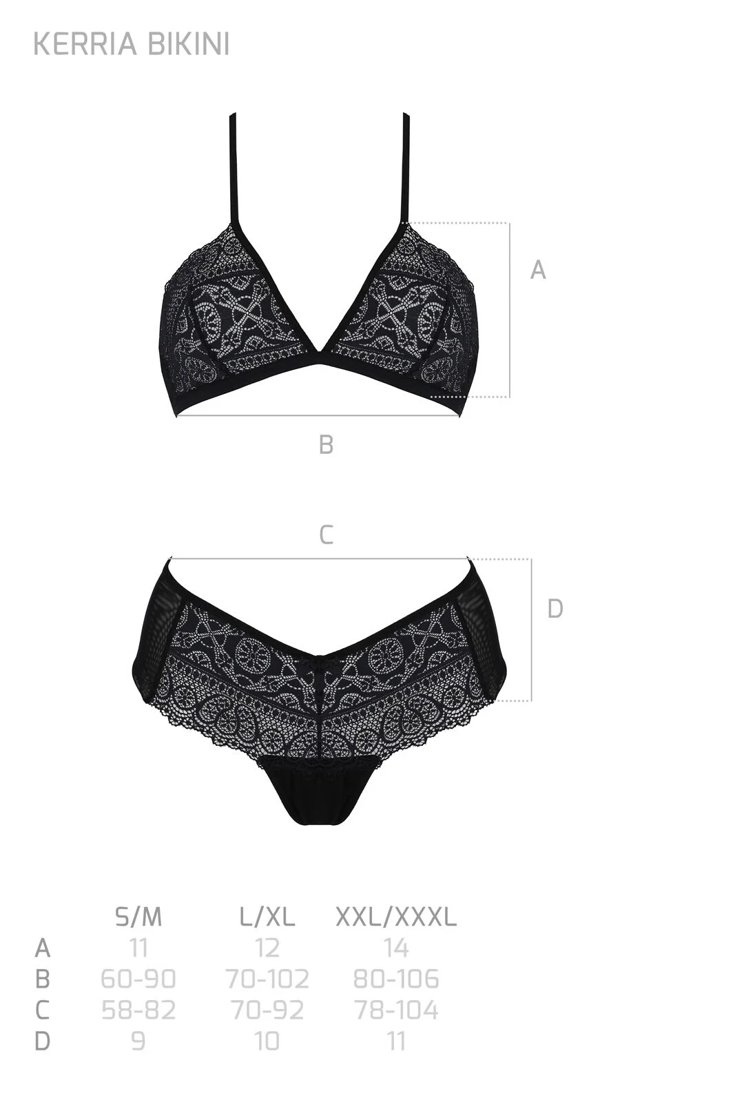 Комплект Passion KERRIA BIKINI виконаний у класичному чорному кольорі, що додає йому загадковості та елегантності. Використання м’якої сіточки та оксамитового мережива з витонченим візерунком у формі кругів і квітів робить цей комплект справжнім витвором мистецтва.