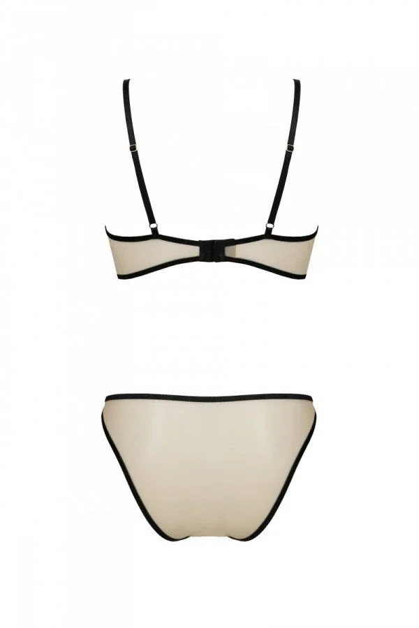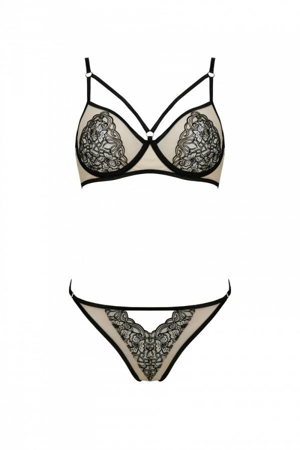Комплект Passion LORINA SET виконаний у ніжному бежевому кольорі, який чудово підходить до будь-якого типу шкіри. Однак, що робить його справді унікальним, так це контрастні чорні елементи, які надають комплекту розкішного вигляду. Вишукані візерунки мережива, що обрамляють бюстгальтер та трусики, створюють враження легкості та грації.