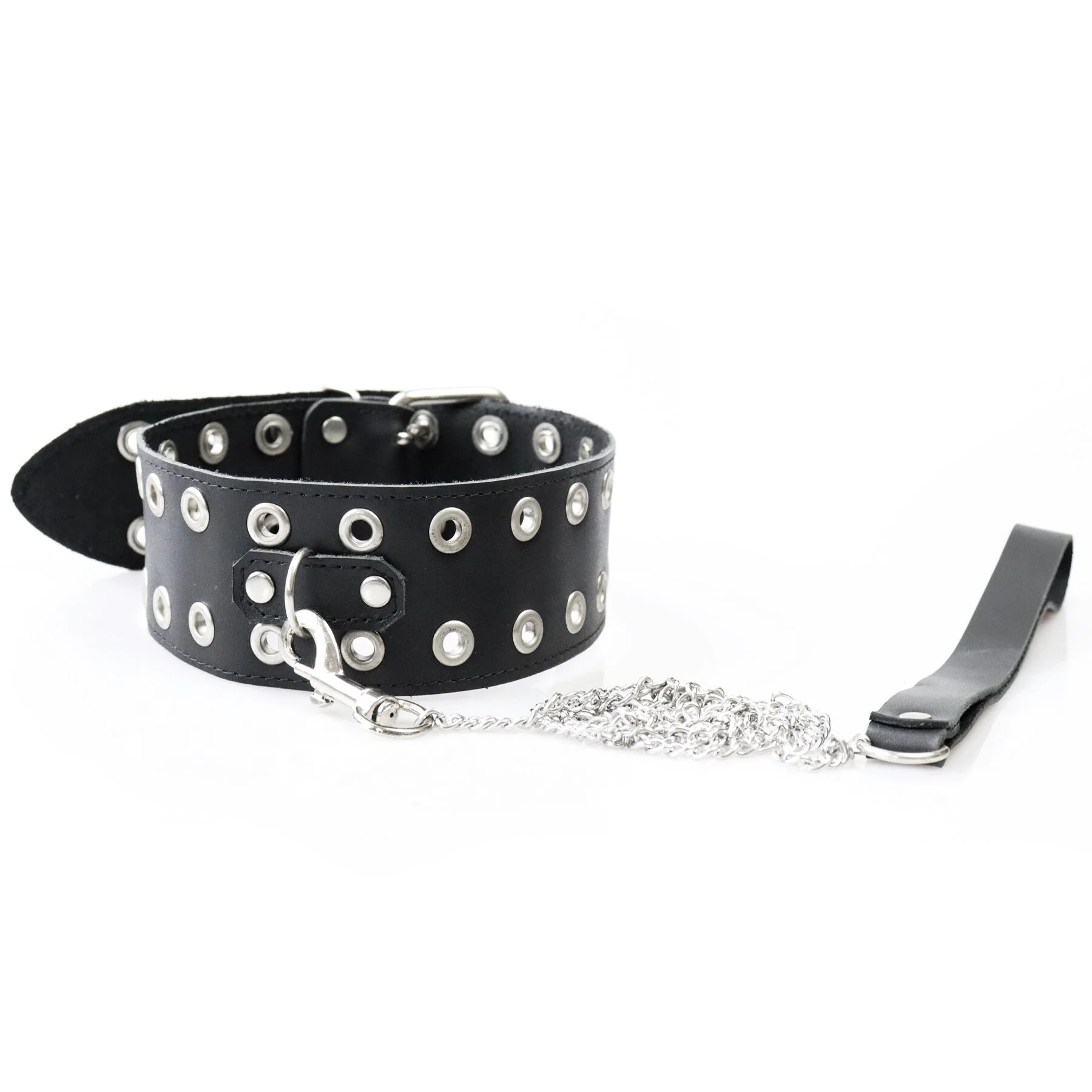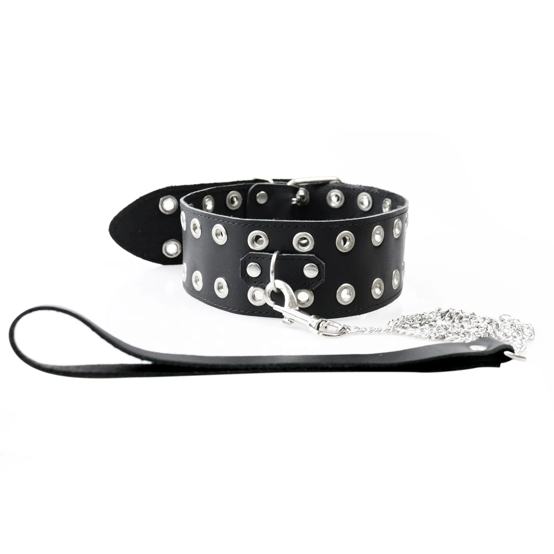 - Декор: Металеві заклепки на нашийнику додають йому аутентичності та підкреслюють його провокаційний вигляд.