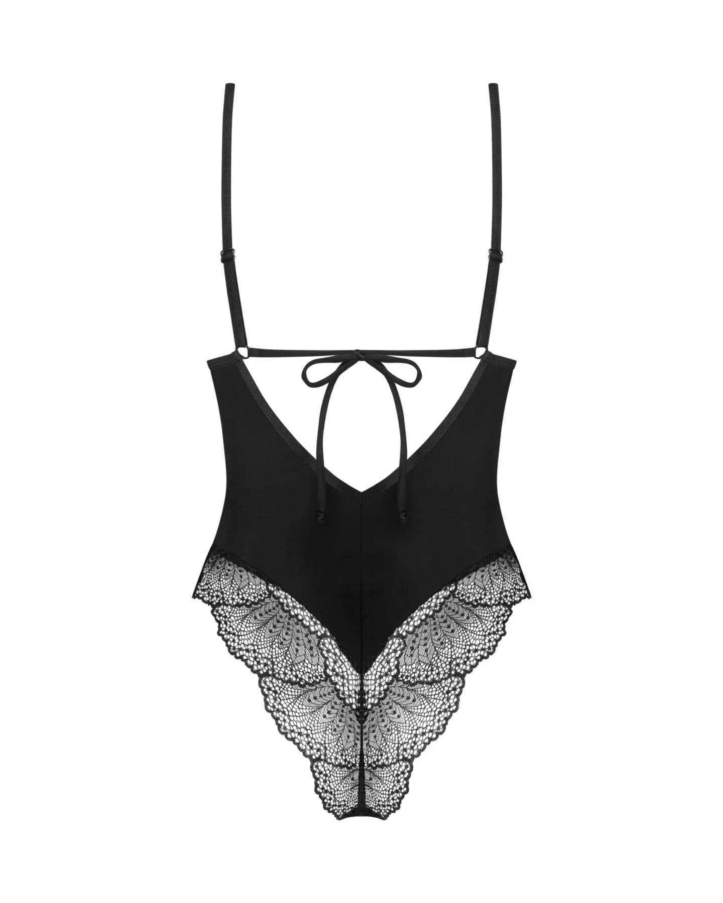 Вибираєте білизну за принципом: «комфортна вдень, спокуслива вночі»? Тоді вам неодмінно варто купити тедді Obsessive Lobellis teddy із глянцевої чорної тканини з повітряним мереживним декором. Спереду вона має вигляд класичної закритої моделі на тонких бретельках із високими вирізами для ніг. Але головний сюрприз розташований ззаду: відкриту попку доповнює глибокий виріз на спині, прикрашений кокетливими зав’язками.