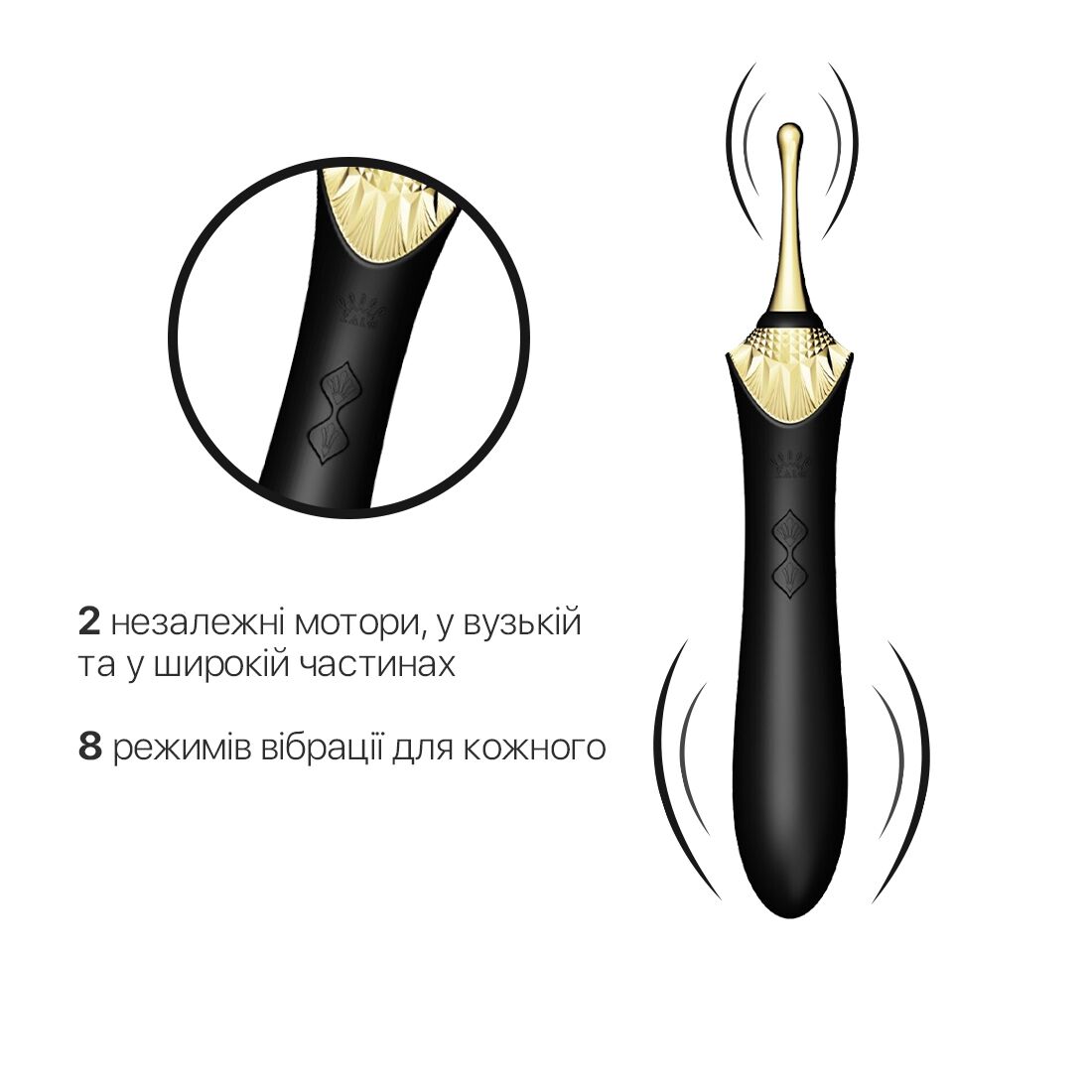 - Два незалежні мотори: Один у вузькій частині з інтенсивною вібрацією, інший у широкій — з ніжною, але глибокою вібрацією. Кожен мотор можна налаштувати окремо.