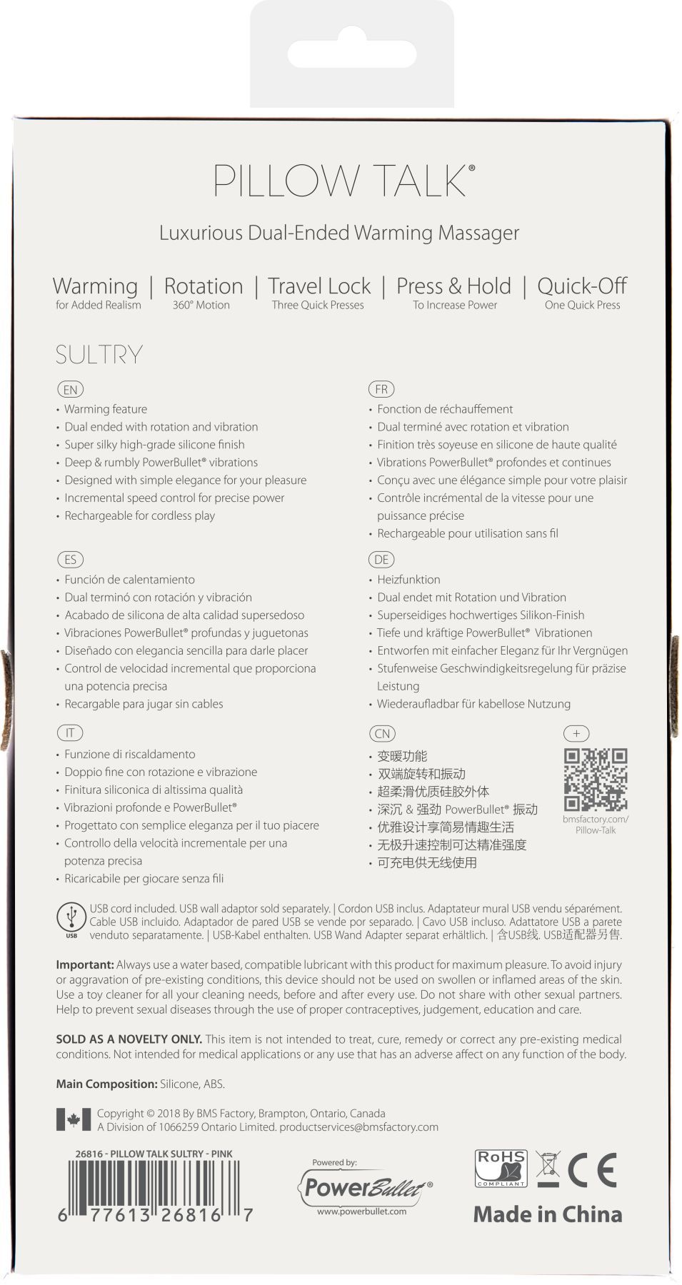 Вібромасажер PILLOW TALK – Sultry Pink – це не просто іграшка. Це інструмент для відкриття нових граней задоволення, що поєднує в собі стиль, функціональність та якість. Він стане чудовим доповненням до вашого інтимного життя, допомагаючи розслабитися та насолодитися кожною миттю.